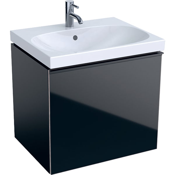 1) Тумба для раковины Geberit Acanto с выдвижным и внутренним выдвижным ящиком ДСП черный матовый/черное глянцевое стекло