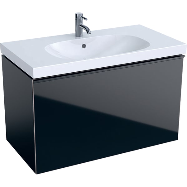 1) Тумба для раковины Geberit Acanto с выдвижным и внутренним выдвижным ящиком ДСП черный матовый/черное глянцевое стекло