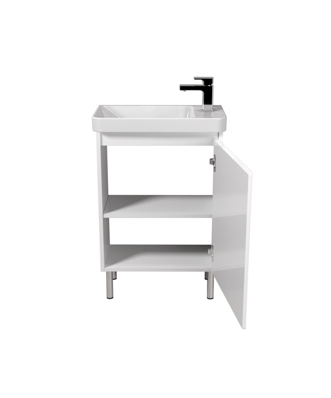 Фасад изготовлен из влагостойкого крашеного МДФ Kronospan, корпус – из ДСП. Глянцевая белая поверхность придает легкость и визуальное пространство, прекрасно сочетается с любыми отделочными материалами. Умывальник Dana 55 производства Турции изготовлен из качественного фарфора, имеет правосторонний слив, идеально подходящий к особенностям размещения водопровода.