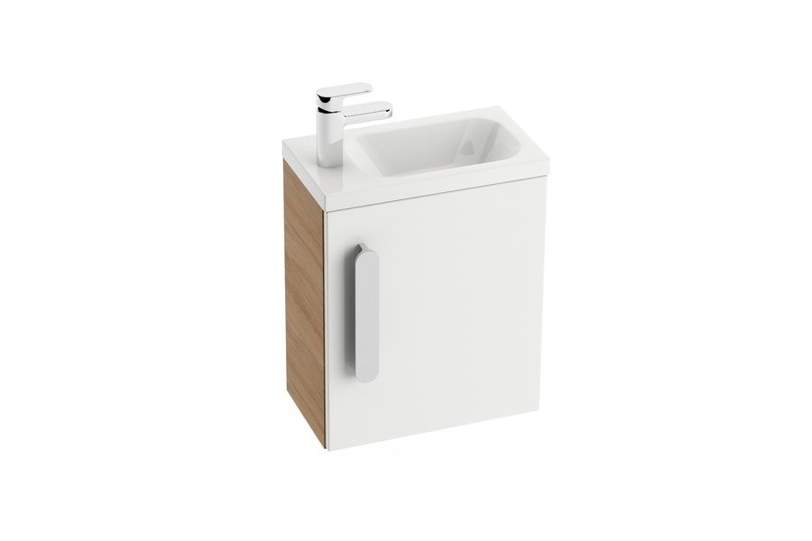 Шкафчик идеально повторяет форму керамического умывальника и увеличивает его потребительскую ценность в виде объемного пространства для вещей. За выдвижной дверцой скрывается высокий ящик, способный вместить в себя все, начиная от полотенец и заканчивая косметикой.
