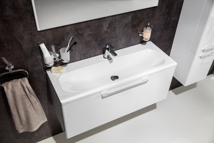 Набор мебели и умывальников из композитного материала идеально сочетается с остальным оборудованием для ванных комнат. Подходит везде. Современный, игривый, и в тоже время простой look подчеркнут закругленными краями.