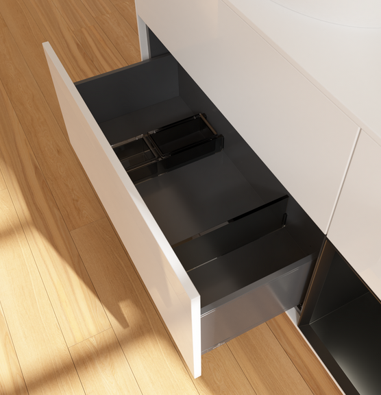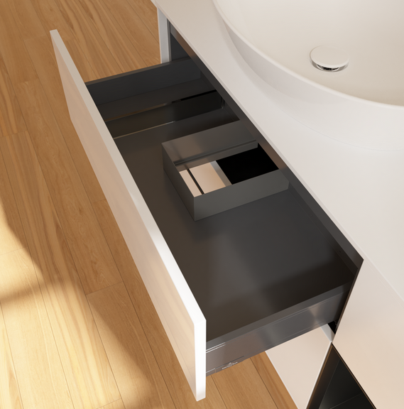 Полное выдвижение. Благодаря функции полного выдвижения выдвижные ящики можно полностью выдвигать. Все их содержимое хорошо видно и его удобно доставать. Больше не нужно копаться в дальних отсеках выдвижного ящика — благодаря мебели для ванной с полным выдвижением вы получаете полный обзор.