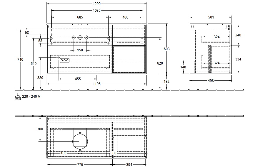 с подсветкой полки, ящики с функцией SoftClosing, с функцией Push-to-open, без отверстий под смеситель