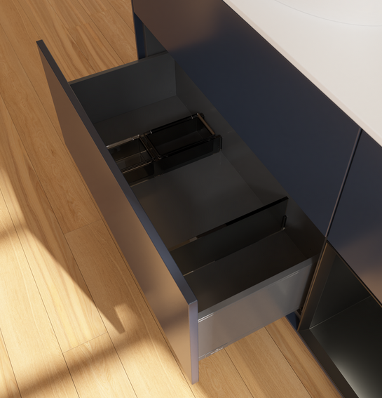 Полное выдвижение. Благодаря функции полного выдвижения выдвижные ящики можно полностью выдвигать. Все их содержимое хорошо видно и его удобно доставать. Больше не нужно копаться в дальних отсеках выдвижного ящика — благодаря мебели для ванной с полным выдвижением вы получаете полный обзор.