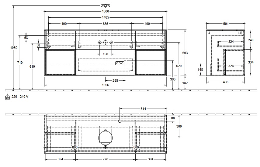 с подсветкой полки, ящики с функцией SoftClosing, с функцией Push-to-open, с просверленным отверстием под смеситель