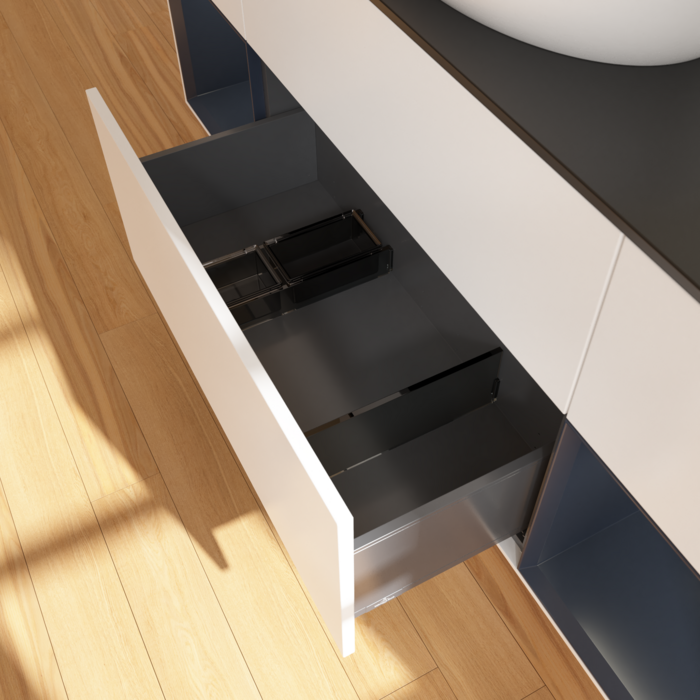 Полное выдвижение. Благодаря функции полного выдвижения выдвижные ящики можно полностью выдвигать. Все их содержимое хорошо видно и его удобно доставать. Больше не нужно копаться в дальних отсеках выдвижного ящика — благодаря мебели для ванной с полным выдвижением вы получаете полный обзор.