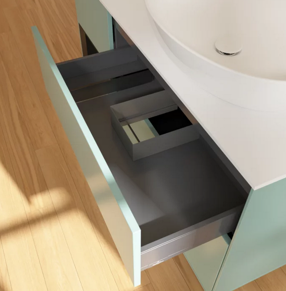 Полное выдвижение. Благодаря функции полного выдвижения выдвижные ящики можно полностью выдвигать. Все их содержимое хорошо видно и его удобно доставать. Больше не нужно копаться в дальних отсеках выдвижного ящика — благодаря мебели для ванной с полным выдвижением вы получаете полный обзор.