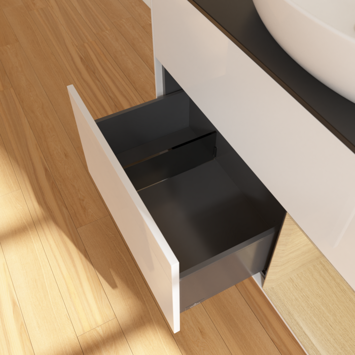 Полное выдвижение. Благодаря функции полного выдвижения выдвижные ящики можно полностью выдвигать. Все их содержимое хорошо видно и его удобно доставать. Больше не нужно копаться в дальних отсеках выдвижного ящика — благодаря мебели для ванной с полным выдвижением вы получаете полный обзор.