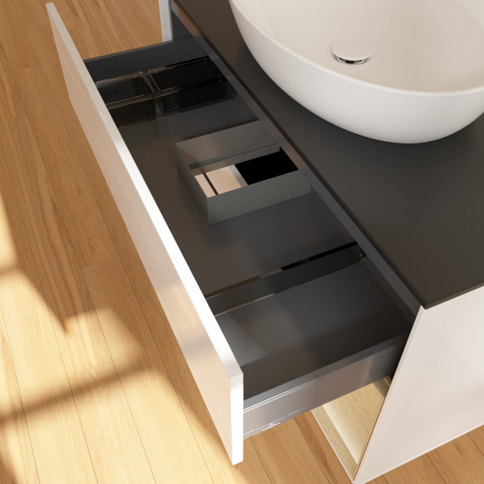 Продуманное внутреннее разделение мебели для ванной Villeroy & Boch позволяет создать индивидуальную систему организации пространства в ванной комнате. Элементы, расположение которых можно менять, например регулируемые стеклянные перегородки и контейнеры для аксессуаров различных размеров, обеспечивают хороший обзор и порядок. Благодаря практичной системе внутреннего разделения вы будете быстро находить принадлежности для ванной, которыми вы постоянно пользуетесь.
