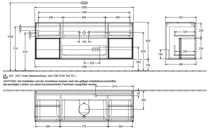 с подсветкой полки и настенным освещением, ящики с функцией SoftClosing, с функцией Push-to-open, с просверленным отверстием под смеситель