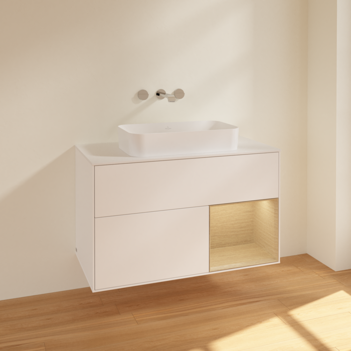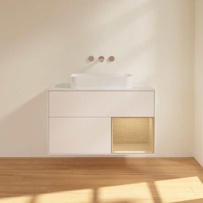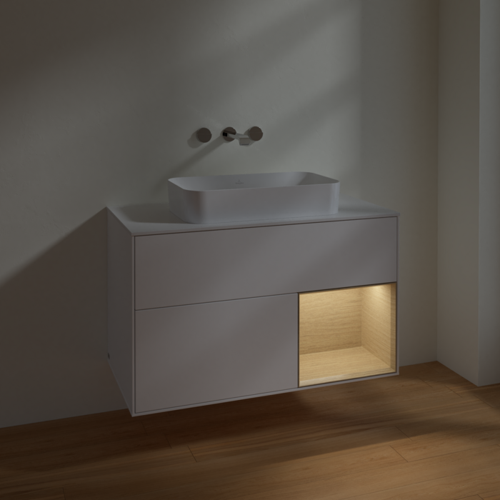 Плавно регулируемая подсветка мебели для ванной комнаты. Освещение, встроенное в мебель для ванной комнаты Villeroy & Boch, всегда обеспечивает правильное освещение в ванной комнате. Энергосберегающее светодиодное освещение можно плавно затемнять и регулировать с помощью пульта дистанционного управления от холодного белого до теплого белого. Искусно расположенные элементы освещения создают индивидуальное настроение в ванной комнате.
