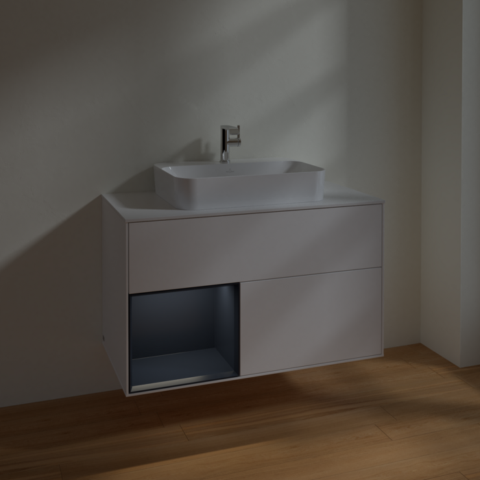 Плавно регулируемая подсветка мебели для ванной комнаты. Освещение, встроенное в мебель для ванной комнаты Villeroy & Boch, всегда обеспечивает правильное освещение в ванной комнате. Энергосберегающее светодиодное освещение можно плавно затемнять и регулировать с помощью пульта дистанционного управления от холодного белого до теплого белого. Искусно расположенные элементы освещения создают индивидуальное настроение в ванной комнате.