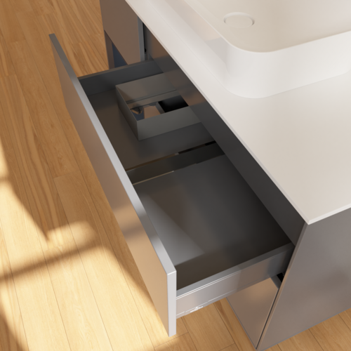 Полное выдвижение. Благодаря функции полного выдвижения выдвижные ящики можно полностью выдвигать. Все их содержимое хорошо видно и его удобно доставать. Больше не нужно копаться в дальних отсеках выдвижного ящика — благодаря мебели для ванной с полным выдвижением вы получаете полный обзор.