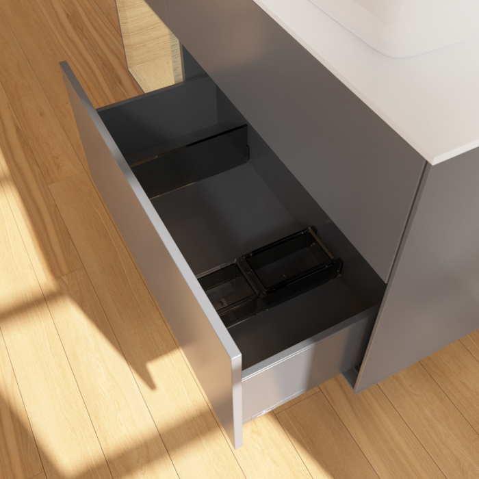 3 выдвижных отделения с противоскользящим ковриком (1 высокая стеклянная перегородка,3 низкие стеклянные перегородки, 1 контейнер для аксессуаров S, 1 контейнер для аксессуаров M)