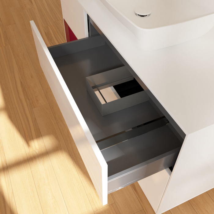 Практичные внутренние перегородки. Продуманные внутренние перегородки в мебели для ванной комнаты Villeroy & Boch позволяют индивидуально поддерживать порядок в ванной комнате. Различные элементы, такие как регулируемые стеклянные перегородки и ящики для аксессуаров различных размеров, обеспечивают порядок и хороший обзор. Благодаря практичным внутренним перегородкам вы сможете с первого взгляда найти часто используемые аксессуары для ванной комнаты.