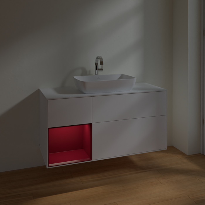 Плавно регулируемая подсветка мебели для ванной комнаты. Освещение, встроенное в мебель для ванной комнаты Villeroy & Boch, всегда обеспечивает правильное освещение в ванной комнате. Энергосберегающее светодиодное освещение можно плавно затемнять и регулировать с помощью пульта дистанционного управления от холодного белого до теплого белого. Искусно расположенные элементы освещения создают индивидуальное настроение в ванной комнате.
