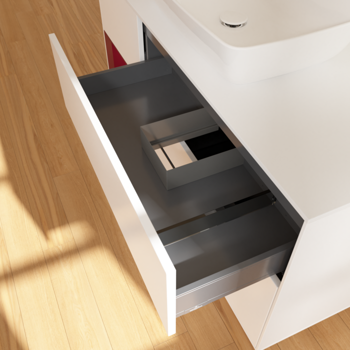 Практичные внутренние перегородки. Продуманные внутренние перегородки в мебели для ванной комнаты Villeroy & Boch позволяют индивидуально поддерживать порядок в ванной комнате. Различные элементы, такие как регулируемые стеклянные перегородки и ящики для аксессуаров различных размеров, обеспечивают порядок и хороший обзор. Благодаря практичным внутренним перегородкам вы сможете с первого взгляда найти часто используемые аксессуары для ванной комнаты.