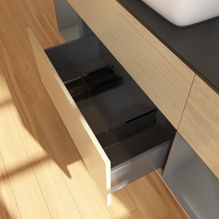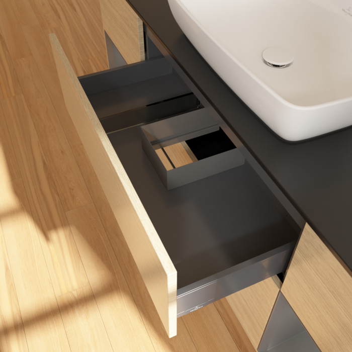 Практичные внутренние перегородки. Продуманные внутренние перегородки в мебели для ванной комнаты Villeroy & Boch позволяют индивидуально поддерживать порядок в ванной комнате. Различные элементы, такие как регулируемые стеклянные перегородки и ящики для аксессуаров различных размеров, обеспечивают порядок и хороший обзор. Благодаря практичным внутренним перегородкам вы сможете с первого взгляда найти часто используемые аксессуары для ванной комнаты.