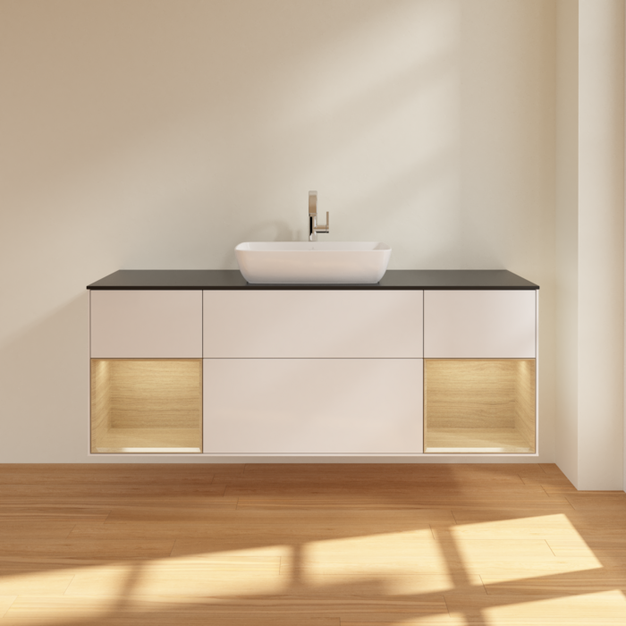 Плавно регулируемая подсветка мебели для ванной комнаты. Освещение, встроенное в мебель для ванной комнаты Villeroy & Boch, всегда обеспечивает правильное освещение в ванной комнате. Энергосберегающее светодиодное освещение можно плавно затемнять и регулировать с помощью пульта дистанционного управления от холодного белого до теплого белого. Искусно расположенные элементы освещения создают индивидуальное настроение в ванной комнате.