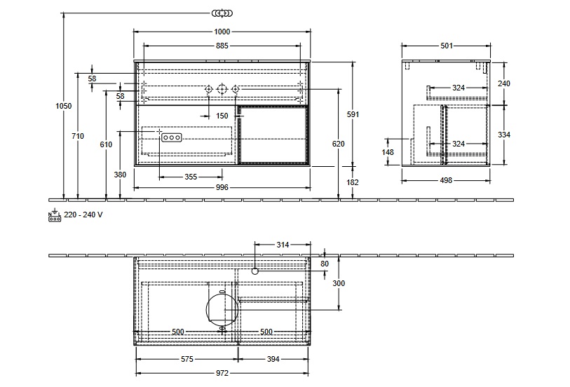 с подсветкой полки, ящики с функцией SoftClosing, с функцией Push-to-open, с отверстием под смеситель