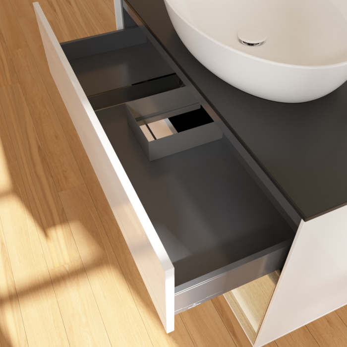 Продуманное внутреннее разделение мебели для ванной Villeroy & Boch позволяет создать индивидуальную систему организации пространства в ванной комнате. Элементы, расположение которых можно менять, например регулируемые стеклянные перегородки и контейнеры для аксессуаров различных размеров, обеспечивают хороший обзор и порядок. Благодаря практичной системе внутреннего разделения вы будете быстро находить принадлежности для ванной, которыми вы постоянно пользуетесь.