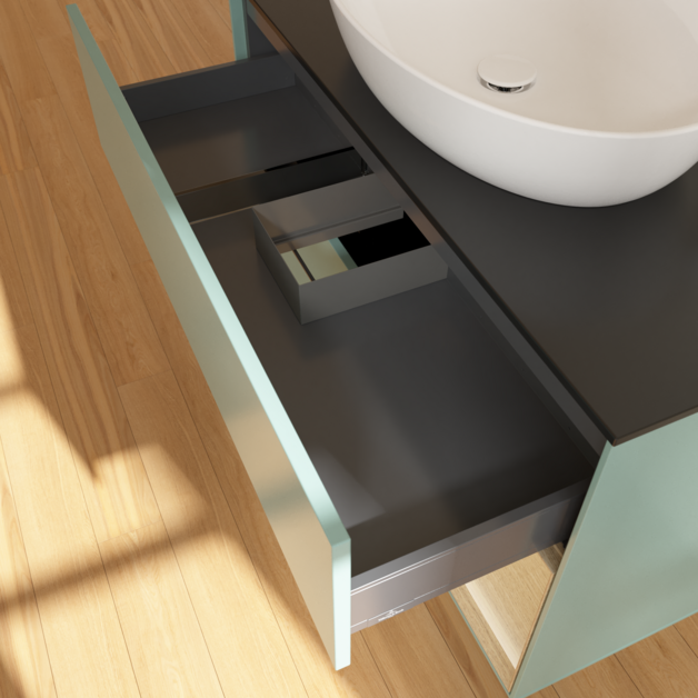 2 выдвижных ящика (1 высокая стеклянная перегородка, 2 выдвижных отделения с противоскользящим ковриком, 3 низкие стеклянные перегородки, 1 контейнер для аксессуаров S, 1 контейнер для аксессуаров M)