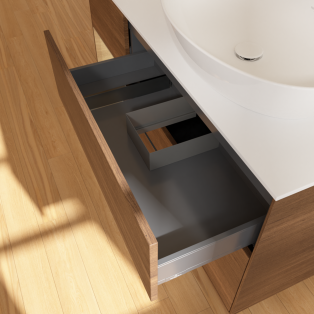 Продуманное внутреннее разделение мебели для ванной Villeroy & Boch позволяет создать индивидуальную систему организации пространства в ванной комнате. Элементы, расположение которых можно менять, например регулируемые стеклянные перегородки и контейнеры для аксессуаров различных размеров, обеспечивают хороший обзор и порядок. Благодаря практичной системе внутреннего разделения вы будете быстро находить принадлежности для ванной, которыми вы постоянно пользуетесь.
