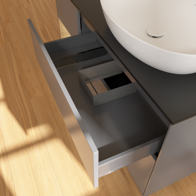 Полное выдвижение. Благодаря функции полного выдвижения выдвижные ящики можно полностью выдвигать. Все их содержимое хорошо видно и его удобно доставать. Больше не нужно копаться в дальних отсеках выдвижного ящика — благодаря мебели для ванной с полным выдвижением вы получаете полный обзор.