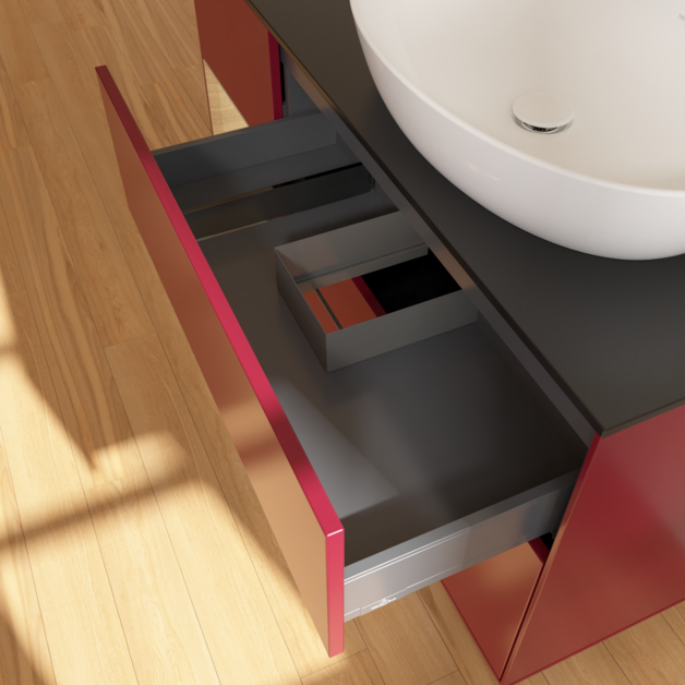 Полное выдвижение. Благодаря функции полного выдвижения выдвижные ящики можно полностью выдвигать. Все их содержимое хорошо видно и его удобно доставать. Больше не нужно копаться в дальних отсеках выдвижного ящика — благодаря мебели для ванной с полным выдвижением вы получаете полный обзор.
