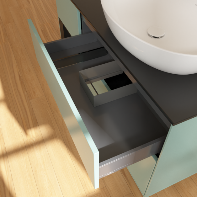 Полное выдвижение. Благодаря функции полного выдвижения выдвижные ящики можно полностью выдвигать. Все их содержимое хорошо видно и его удобно доставать. Больше не нужно копаться в дальних отсеках выдвижного ящика — благодаря мебели для ванной с полным выдвижением вы получаете полный обзор.