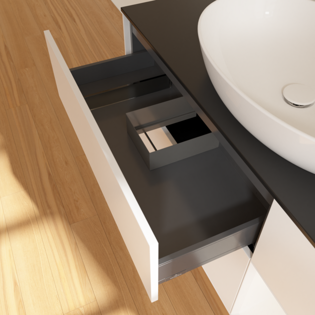 Полное выдвижение. Благодаря функции полного выдвижения выдвижные ящики можно полностью выдвигать. Все их содержимое хорошо видно и его удобно доставать. Больше не нужно копаться в дальних отсеках выдвижного ящика — благодаря мебели для ванной с полным выдвижением вы получаете полный обзор.