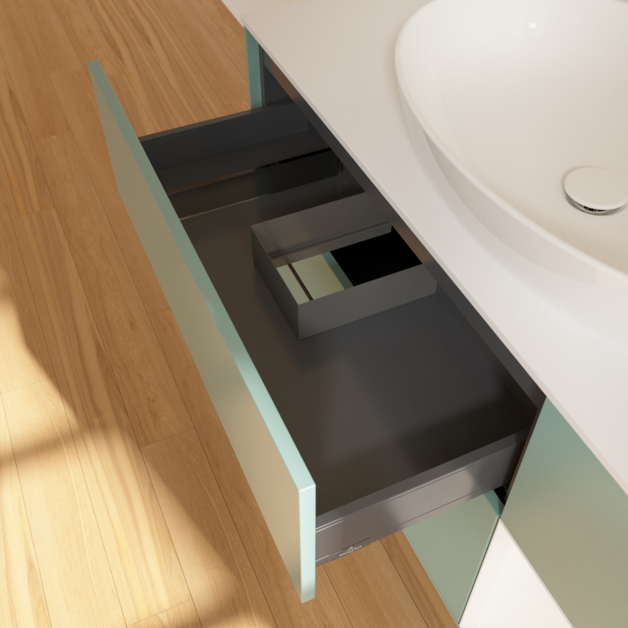 Полное выдвижение. Благодаря функции полного выдвижения выдвижные ящики можно полностью выдвигать. Все их содержимое хорошо видно и его удобно доставать. Больше не нужно копаться в дальних отсеках выдвижного ящика — благодаря мебели для ванной с полным выдвижением вы получаете полный обзор.