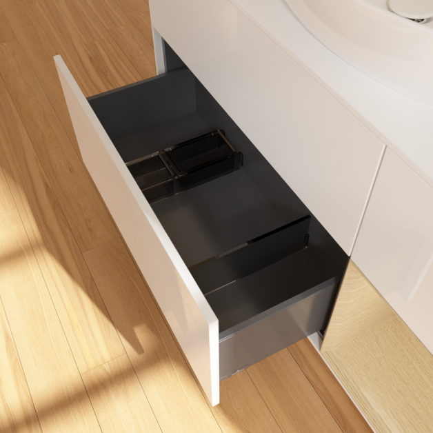 Продуманное внутреннее разделение мебели для ванной Villeroy & Boch позволяет создать индивидуальную систему организации пространства в ванной комнате. Элементы, расположение которых можно менять, например регулируемые стеклянные перегородки и контейнеры для аксессуаров различных размеров, обеспечивают хороший обзор и порядок. Благодаря практичной системе внутреннего разделения вы будете быстро находить принадлежности для ванной, которыми вы постоянно пользуетесь.