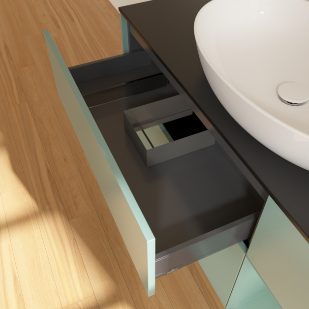 Полное выдвижение. Благодаря функции полного выдвижения выдвижные ящики можно полностью выдвигать. Все их содержимое хорошо видно и его удобно доставать. Больше не нужно копаться в дальних отсеках выдвижного ящика — благодаря мебели для ванной с полным выдвижением вы получаете полный обзор.