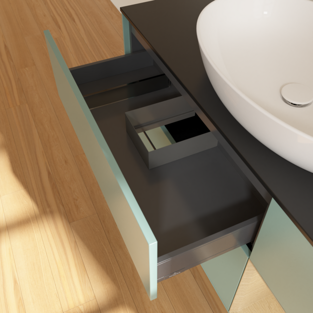 Полное выдвижение. Благодаря функции полного выдвижения выдвижные ящики можно полностью выдвигать. Все их содержимое хорошо видно и его удобно доставать. Больше не нужно копаться в дальних отсеках выдвижного ящика — благодаря мебели для ванной с полным выдвижением вы получаете полный обзор.