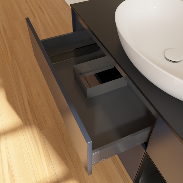 Полное выдвижение. Благодаря функции полного выдвижения выдвижные ящики можно полностью выдвигать. Все их содержимое хорошо видно и его удобно доставать. Больше не нужно копаться в дальних отсеках выдвижного ящика — благодаря мебели для ванной с полным выдвижением вы получаете полный обзор.