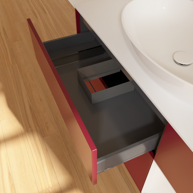 Полное выдвижение. Благодаря функции полного выдвижения выдвижные ящики можно полностью выдвигать. Все их содержимое хорошо видно и его удобно доставать. Больше не нужно копаться в дальних отсеках выдвижного ящика — благодаря мебели для ванной с полным выдвижением вы получаете полный обзор.