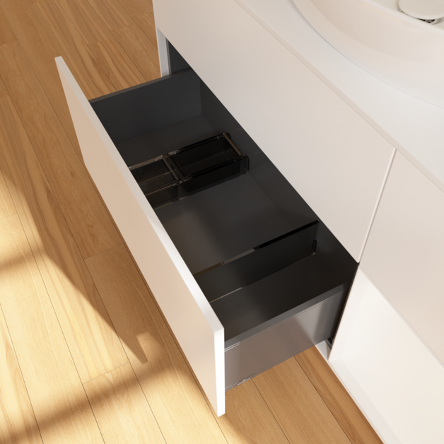 Полное выдвижение. Благодаря функции полного выдвижения выдвижные ящики можно полностью выдвигать. Все их содержимое хорошо видно и его удобно доставать. Больше не нужно копаться в дальних отсеках выдвижного ящика — благодаря мебели для ванной с полным выдвижением вы получаете полный обзор.