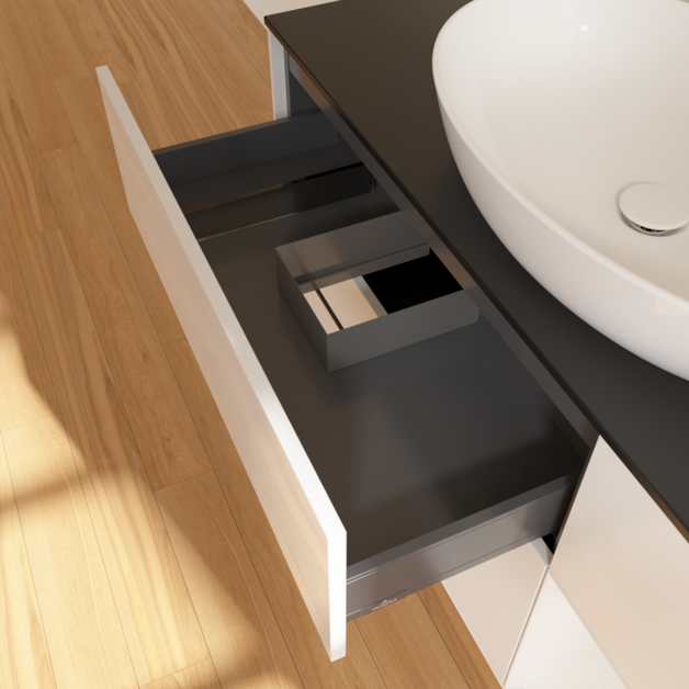 Полное выдвижение. Благодаря функции полного выдвижения выдвижные ящики можно полностью выдвигать. Все их содержимое хорошо видно и его удобно доставать. Больше не нужно копаться в дальних отсеках выдвижного ящика — благодаря мебели для ванной с полным выдвижением вы получаете полный обзор.