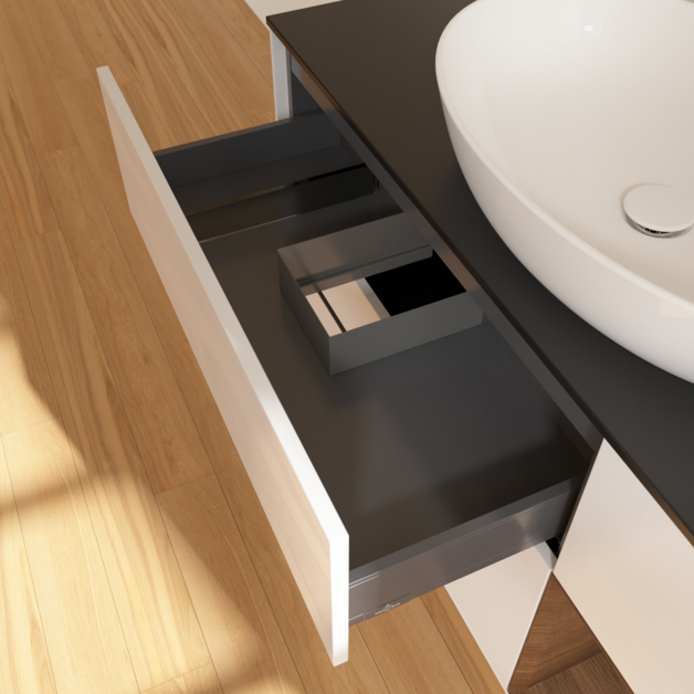 Полное выдвижение. Благодаря функции полного выдвижения выдвижные ящики можно полностью выдвигать. Все их содержимое хорошо видно и его удобно доставать. Больше не нужно копаться в дальних отсеках выдвижного ящика — благодаря мебели для ванной с полным выдвижением вы получаете полный обзор.
