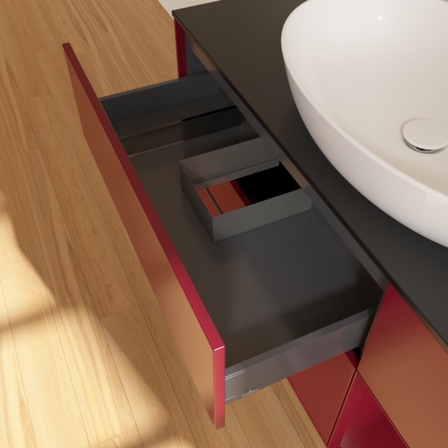 Полное выдвижение. Благодаря функции полного выдвижения выдвижные ящики можно полностью выдвигать. Все их содержимое хорошо видно и его удобно доставать. Больше не нужно копаться в дальних отсеках выдвижного ящика — благодаря мебели для ванной с полным выдвижением вы получаете полный обзор.