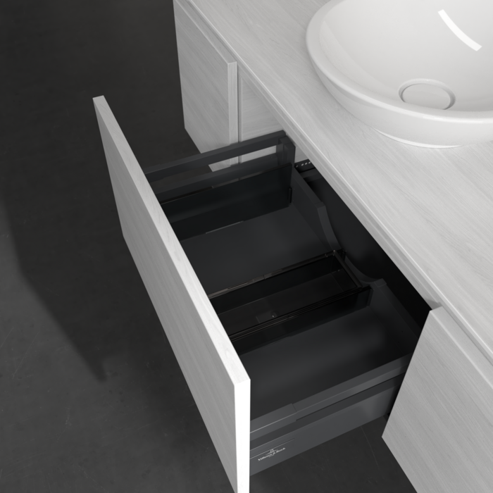 Практичные внутренние перегородки. Продуманные внутренние перегородки в мебели для ванной комнаты Villeroy & Boch позволяют индивидуально поддерживать порядок в ванной комнате. Различные элементы, такие как регулируемые стеклянные перегородки и ящики для аксессуаров различных размеров, обеспечивают порядок и хороший обзор.