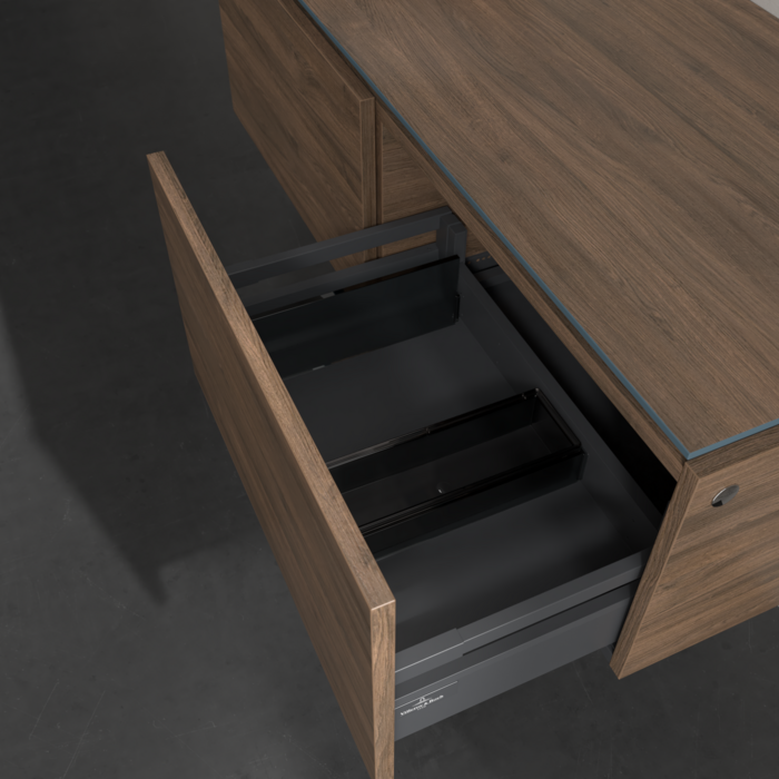 Практичные внутренние перегородки. Продуманные внутренние перегородки в мебели для ванной комнаты Villeroy & Boch позволяют индивидуально поддерживать порядок в ванной комнате. Различные элементы, такие как регулируемые стеклянные перегородки и ящики для аксессуаров различных размеров, обеспечивают порядок и хороший обзор.