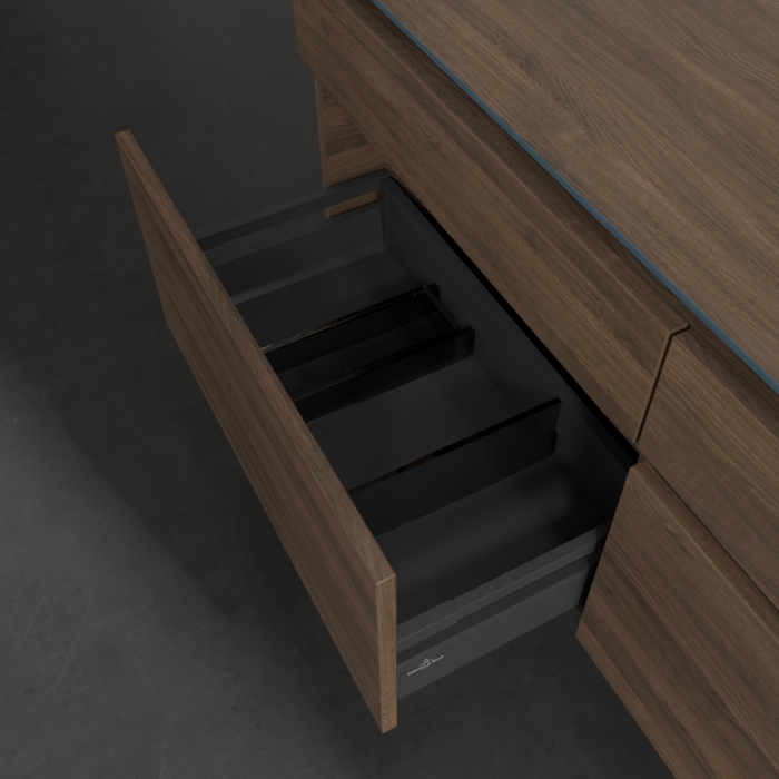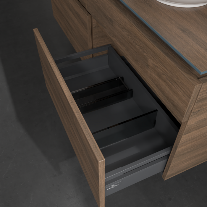 Практичные внутренние перегородки. Продуманные внутренние перегородки в мебели для ванной комнаты Villeroy & Boch позволяют индивидуально поддерживать порядок в ванной комнате. Различные элементы, такие как регулируемые стеклянные перегородки и ящики для аксессуаров различных размеров, обеспечивают порядок и хороший обзор.