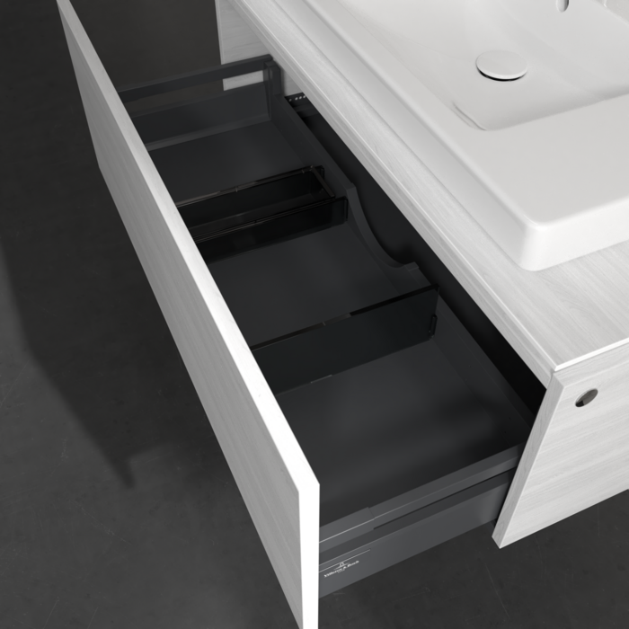 Практичные внутренние перегородки. Продуманные внутренние перегородки в мебели для ванной комнаты Villeroy & Boch позволяют индивидуально поддерживать порядок в ванной комнате. Различные элементы, такие как регулируемые стеклянные перегородки и ящики для аксессуаров различных размеров, обеспечивают порядок и хороший обзор.