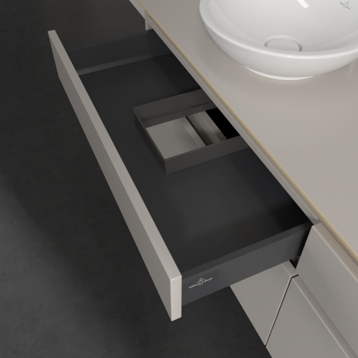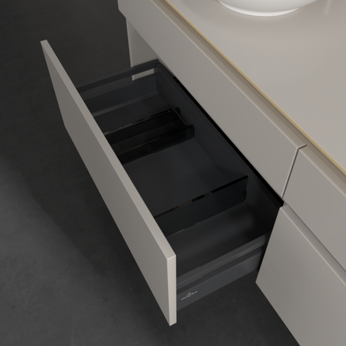 Практичные внутренние перегородки. Продуманные внутренние перегородки в мебели для ванной комнаты Villeroy & Boch позволяют индивидуально поддерживать порядок в ванной комнате. Различные элементы, такие как регулируемые стеклянные перегородки и ящики для аксессуаров различных размеров, обеспечивают порядок и хороший обзор.