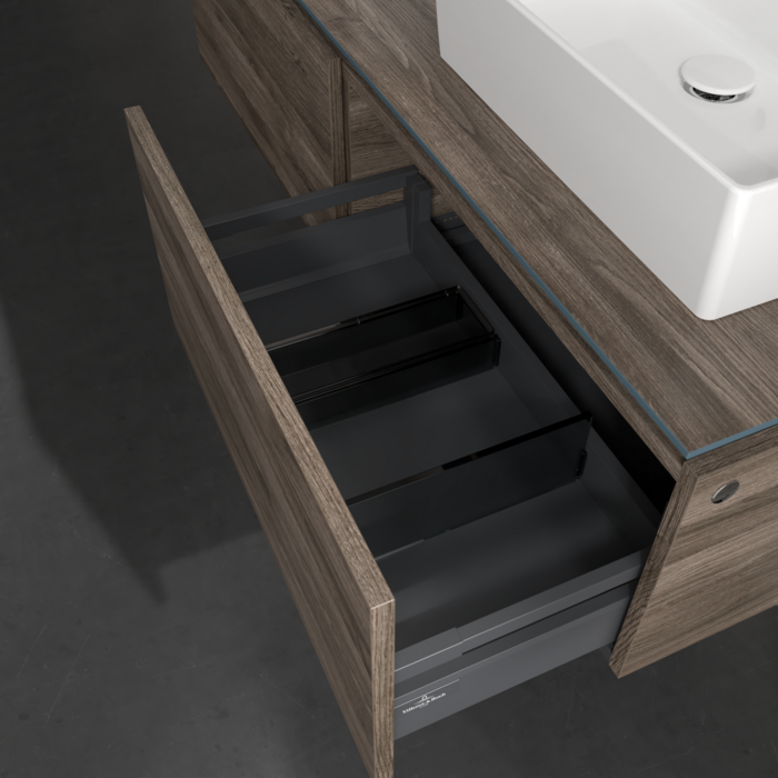 Практичные внутренние перегородки. Продуманные внутренние перегородки в мебели для ванной комнаты Villeroy & Boch позволяют индивидуально поддерживать порядок в ванной комнате. Различные элементы, такие как регулируемые стеклянные перегородки и ящики для аксессуаров различных размеров, обеспечивают порядок и хороший обзор.