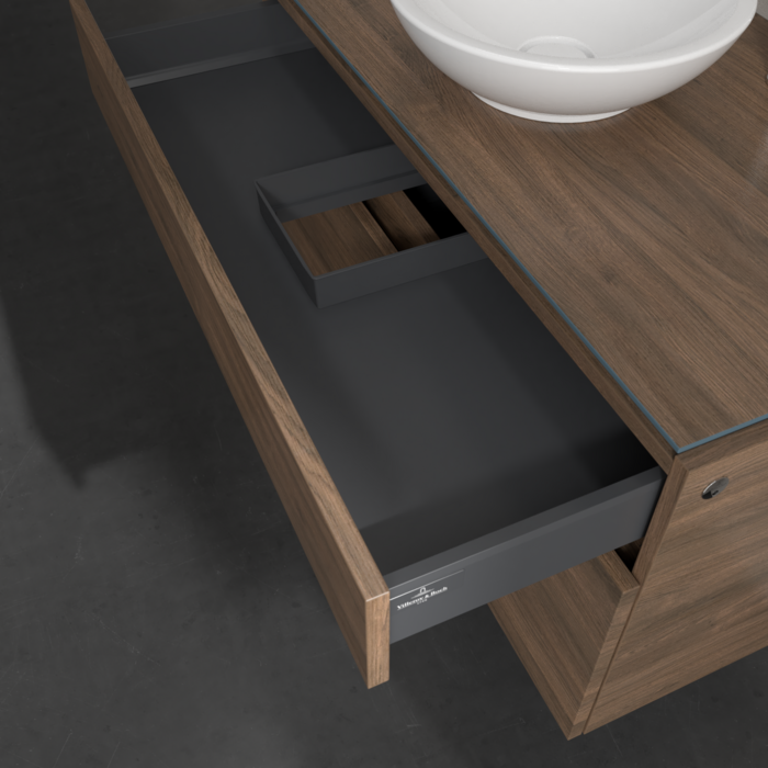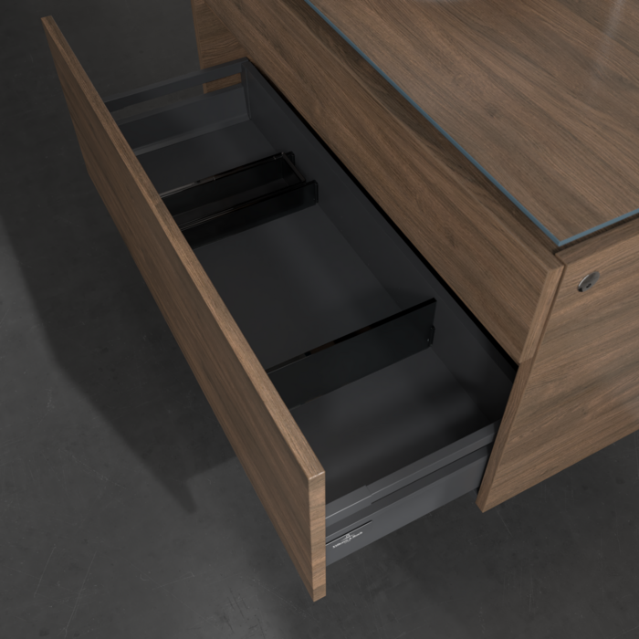 Практичные внутренние перегородки. Продуманные внутренние перегородки в мебели для ванной комнаты Villeroy & Boch позволяют индивидуально поддерживать порядок в ванной комнате. Различные элементы, такие как регулируемые стеклянные перегородки и ящики для аксессуаров различных размеров, обеспечивают порядок и хороший обзор.