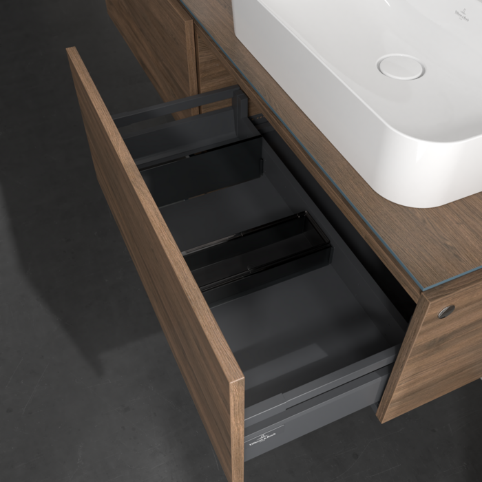 Практичные внутренние перегородки. Продуманные внутренние перегородки в мебели для ванной комнаты Villeroy & Boch позволяют индивидуально поддерживать порядок в ванной комнате. Различные элементы, такие как регулируемые стеклянные перегородки и ящики для аксессуаров различных размеров, обеспечивают порядок и хороший обзор.