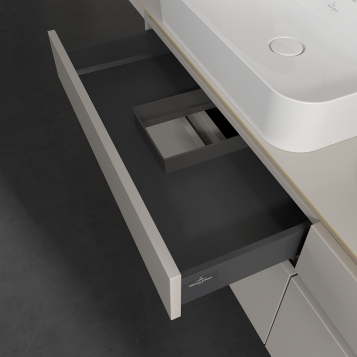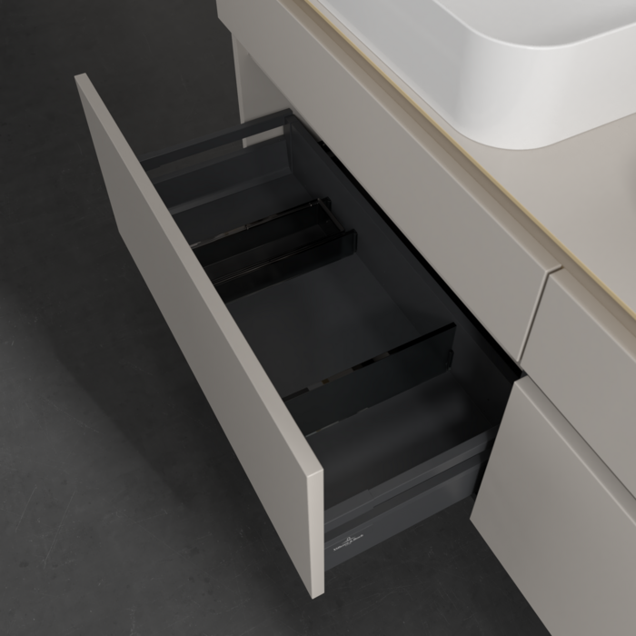 Практичные внутренние перегородки. Продуманные внутренние перегородки в мебели для ванной комнаты Villeroy & Boch позволяют индивидуально поддерживать порядок в ванной комнате. Различные элементы, такие как регулируемые стеклянные перегородки и ящики для аксессуаров различных размеров, обеспечивают порядок и хороший обзор.